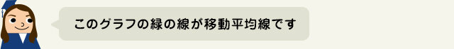 この緑の線は「移動平均線」といいます。しばしばチャートに入っており、よくわからない上に、漢字5文字のいかめしい名前に「とっつきにくさ」を感じてしまう人もいるかもしれません。しかしものすごく単純で、チャート分析をする際に重要な判断材料と重宝されます。