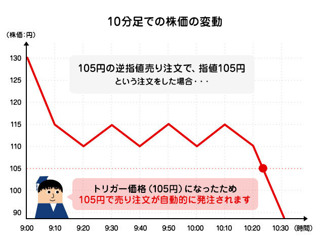 上のグラフのように現在、10分足で下落の後株価が110~115円で保ち合い(相場のトレンドがほぼ横ばいで推移している状態、上下抜けた方向へ大きく動くことがある)で、仮に今の株価が110円の時に、105円まで株価が下がってしまうとさらに株価下落の勢いが増して損失が拡大すると考え、105円の逆指値売り注文で、指値105円という注文をしたとします。その後、110~115円の保ち合いを下抜けあらかじめ逆指値で設定していた105円の指値に到達した場合、指値105円で売り注文が市場へ自動的に発注されます。
