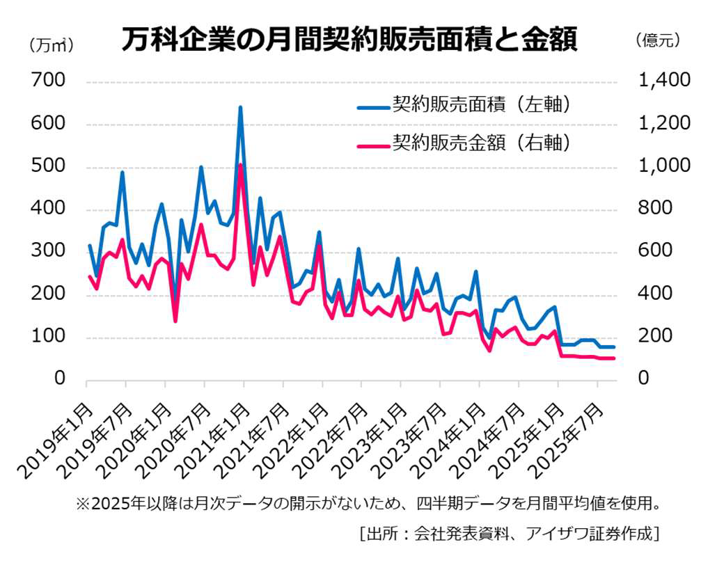 万科企業が資金繰り難に陥った主な背景として、⾧期にわたる不動産の販売低迷がある。2021年以降、中国恒大集団(2025年8月25日に上場廃止)の債務不履行(デフォルト)をきっかけに、不動産デベロッパーの信用不安が強まり、これに伴い万科企業の不動産月間契約販売金額は2021年頃の400億元以上から2025年後半の100億元以下へと大きく落ち込んだ(上図参照)。