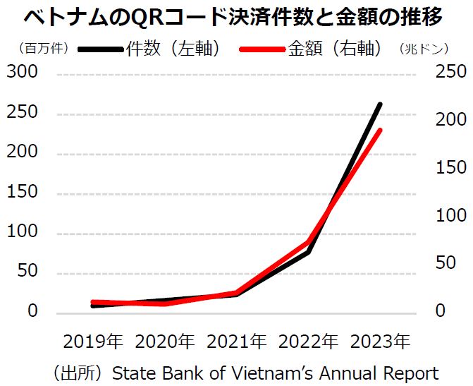 ベトナム中央銀行(SBV)の年次報告書によると、2023 年のQR コードを利用した決済件数は2億6,287 万件で、取引額は191 兆9,300 億ドンであった。これは、前年と比較して件数が242.46%増加し、取引額が157.2%増加したことを示している。特に2021 年にSBV 傘下のベトナム国家決済会社(NAPAS)がQR コードの共通規格「VietQR」とそれに基づく送金サービスの発表以降、利便性が高まり普及が加速した。NAPAS は現在、タイ、カンボジア、ラオスとの間で越境QR コード決済サービスも提供している。今後はこれらの国以外にもサービス提供地域を拡大する方針だ。つい先日、筆者が同サービスをタイで利用してみたところ、残念ながら一時的に利用できない状況であった。複数の国との間でQR コード決済が相互利用可能になることで、ベトナムと周辺国を往来する出張者や旅行者などが現地通貨への換金という煩わしさから解放され、結果として域内の消費拡大を後押しすることが期待される。
