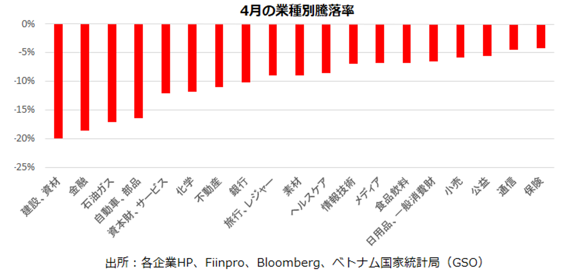 4月のVN指数は軟調な値動きが続きました。FLC会長及び幹部の逮捕、タインホアミングループによる違法社債問題といった不動産関連の悪いニュースがマーケットに影響しました。さらに他の企業の社長が逮捕されるデマ情報も流れるなど、落ち着きのない相場となりました。