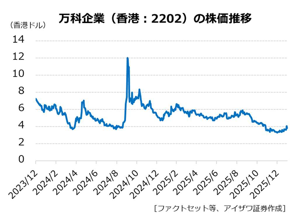 その後、万科企業は前述の社債「22 万科MTN004」に加え、別の社債2本(37億元と11億元)も昨年12月から今年1月にかけて償還・満期前償還請求権行使を迎え、1月27日に債権者と社債の償還延期に合意した。これを受けて、万科企業の株価(右下図参照)はやや持ち直したものの、短期の有利子負債の償還圧力が大きいことを考慮すると、同社がデフォルトに陥るリスクは依然拭えず、今後も資金繰り面で予断を許さない状況が続くだろう。同社の危機は住宅市場そのものに甚大な影響を与えかねないだけに、筆頭株主である政府系の深セン地下鉄集団(持ち株比率27.9%)の追加支援や保有資産の資産売却、社債の償還延期、債務の減免などに加え、住宅市場安定化に向けた政府の思い切った対応が待たれる。