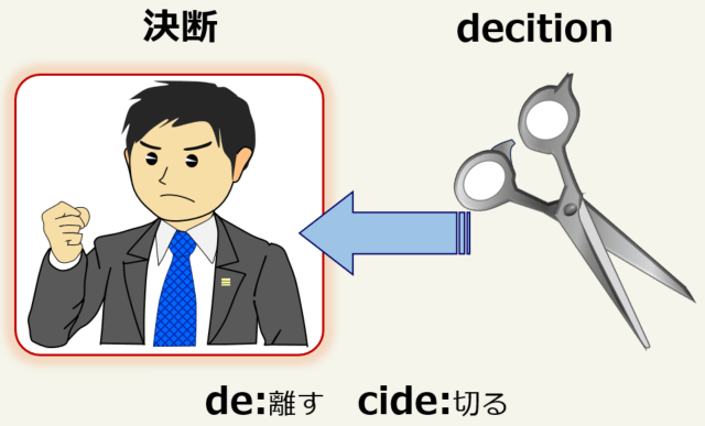 「決断する」は英語で「decide:ディサイド」です。「decide」の語源は「de」が「~から離れて」、「cide」が「切る」を意味しています。従って「decision:ディシジョン」の語源は「切り離す」ということになります。日本語の「決断」も英語の「decision:ディシジョン」も苦悩や葛藤を自分の意志で断ち切るという意味を含んでいます。なお、「切る」を同じ語源とする英単語としては「scissors:シザーズ:はさみ」があります。