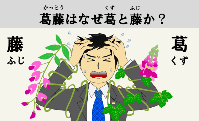 「葛(くず)」も「藤(ふじ)」も他の樹木に巻き付いて茎や葉を成長させるつる性植物の名称であり「相反」や「対立」とは無縁です。「葛」は日本古来の植物であり、その根にあるデンプンから葛粉を精製し葛もち、葛切りなどの和菓子や葛根湯(かっこんとう)などの薬などに利用されてきました。「藤」は藤棚など観賞用として有名で訪日外国人観光客にも人気の植物です。