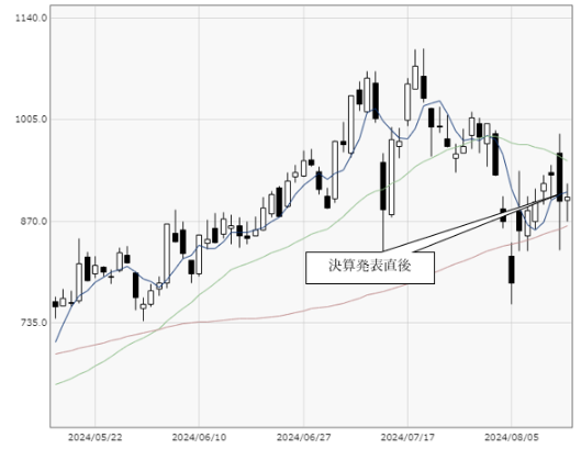 (1)のケースでは、期待買いが先行→決算を受けて一部の投資家が高く買う→追随する投資家がおらず上値が重い→期待買いの投資家が手じまい・・・といった流れが考えられますね。
