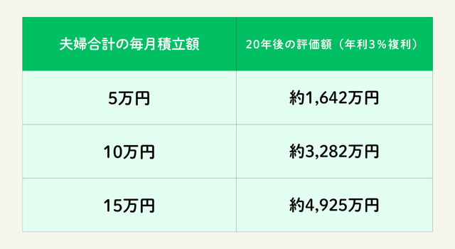 夫婦でNISAを活用し、毎月一定額を積み立てた場合の簡単なシミュレーションを見てみましょう。ここでは夫婦合計の毎月の積立額と、年利3%で運用できた場合の20年後の評価額(元本+運用収益)の目安を示します。