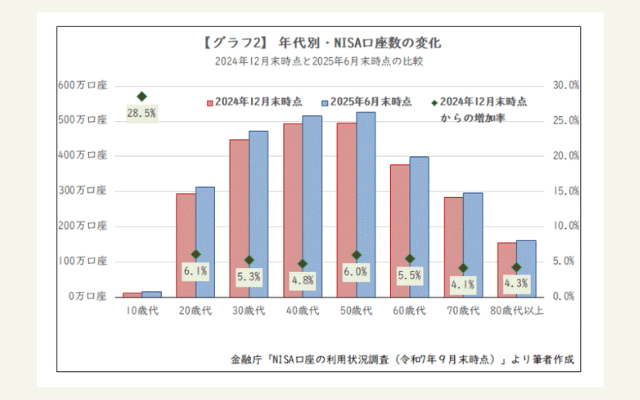 次は視点を変えて、NISA口座数の増加率を年代別見てみましょう。すると、2024年12月末時点に比べて最も口座の増加率が高かったのは、28.5%増の10歳代です。ただし、もともと口座数が少ない年代ですから、半年間で3万口座増えただけで伸び率が高くなりました。次に6.1%増の20歳代、6.0%増の50歳代、5.5%増の60歳代が続きます。