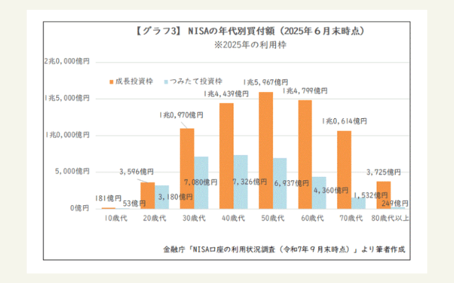 【グラフ3】では、各年代の買付額を、成長投資枠とつみたて投資枠に分けて示しました。