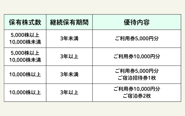 上記の優待に加え、一定の保有株式と継続保有期間の満たした方は、「ホテル インターコンチネンタル 東京ベイ」、「ストリングスホテル名古屋」で利用できる「自社グループホテルご利用券」及び「ご宿泊招待券」が贈呈されます。