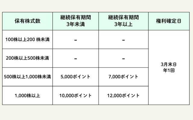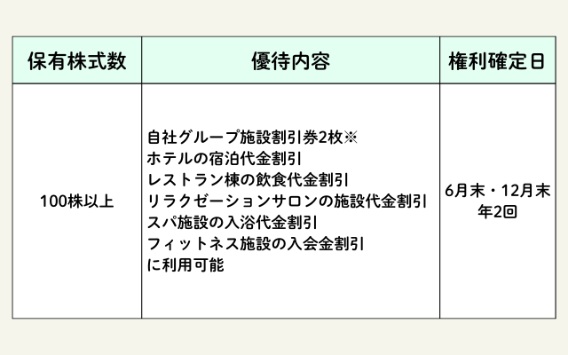 2025年3月末日以降、毎年3月末日の最終の株主名簿に記録された、株式を500株以上保有している株主が対象です。リーガメンバーズに登録後、ポイントが進呈され、100ポイント単位(100ポイント=100円)で、国内13ホテルの宿泊、直営レストラン&バーでの飲食、グルメショップ・オンラインショップでの買い物に利用できます。