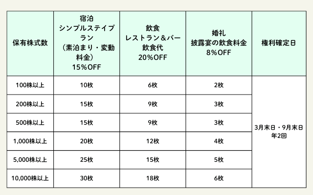 ※株主優待対象ホテルのレストランで利用する場合は、飲食代金から20~30%割引