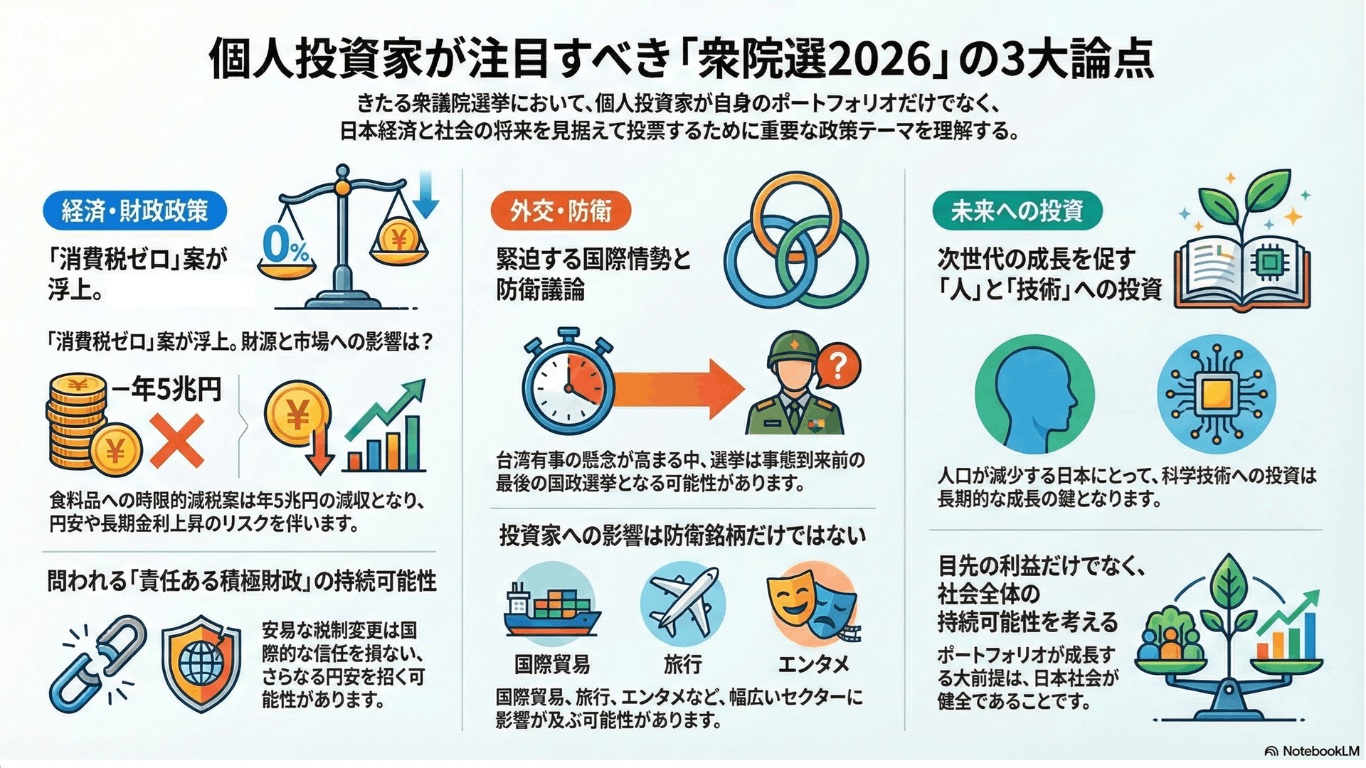 「個人投資家が選挙に注目したいポイント」にはまず、自分のポートフォリオがどのような影響を受けるかが気になります。一方でそれが継続するためには、日本社会が倒れないことが大前提です。生活負担が重くガス欠をしないように、どのような施策が進められていくかを考えましょう。そして存在感の強い国家に囲まれている私たちにとって、国際社会との付き合い方も時代とともに変わってきました。今回の選挙を転換点にできるか、注目です。