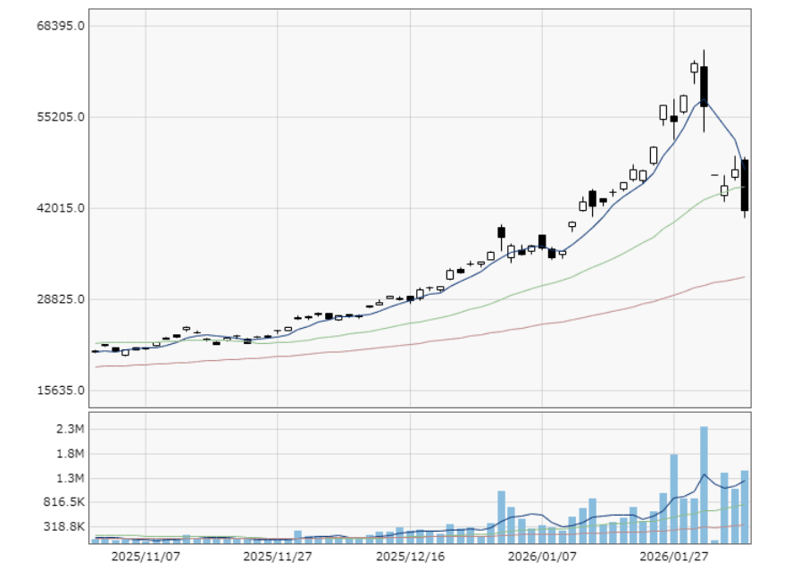 シルバーは宝飾向けのみならず、産業用途として太陽光発電やAIデータセンター向けなどでも必要とされます。そのため、中国輸出規制をきっかけに需給がひっ迫するとの見方から、手元に銀地金を確保しようとする企業の買いが集中しました。そして、その値上がりを見た投機勢も買いを入れたことで、一気に上昇ペースが加速したものと思われます。ですが、1月末から2月初旬にかけて、一転してシルバーやゴールド、プラチナと言った貴金属らは歴史的な暴落に見舞われました。わずか1日から2日の間に、シルバーは34%、ゴールドは13%もの下げを記録しました。