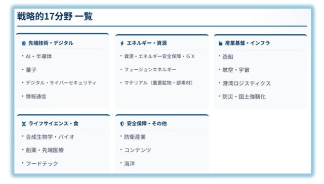高市政権が掲げる17の戦略分野は以下の通りです。