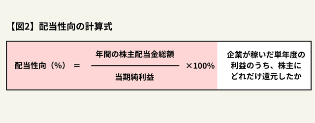 配当性向は、「事業の利益のうち、どれだけを株主に分配するか」の割合です。【図2】は配当性向の計算式です。