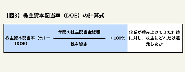 配当性向が当期の利益に対する株主への配分であるのに対し、DOEは、これまでに積み上げてきた利益(株主資本)を基準にした配分です。【図3】にDOEの計算式を示しました。