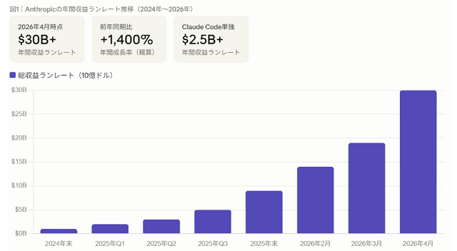 出所:Anthropic公式発表・各種報道より。ランレート=直近の収益を年換算した参考値。