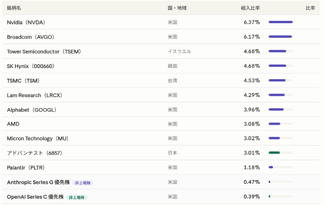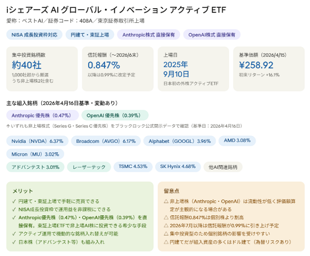 2026年4月17日付けのブラックロック公式開示データにより、408AはAnthropicの優先株(Series G)を0.47%、OpenAIの優先株(Series C)を0.39%で直接保有していることが確認されました。東証上場ETFとして円建て・NISA対応で非上場AI企業の株式に投資できる、日本では数少ない手段の一つです。