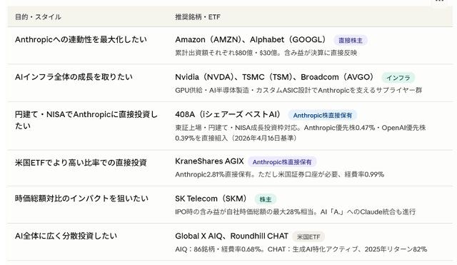 Anthropicは現時点では非上場ですが、上記の銘柄やETFを活用することで、その成長の恩恵を取り込むことが可能です。特に東証上場の408A(ベストAI)は、Anthropicの優先株を0.47%直接保有しており、円建て・NISA対応で非上場AI企業の株式に投資できる日本では数少ない選択肢です。