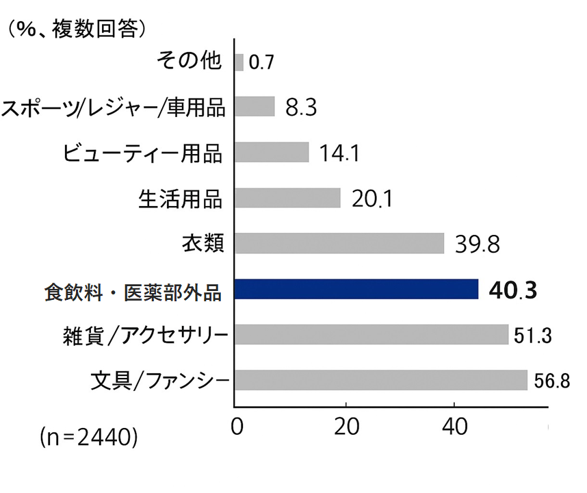 実際、キャラクタープリント商品において食品・医薬部外品の購入経験率は40.3%と、文具・アクセサリーに次いで高い水準にあります。