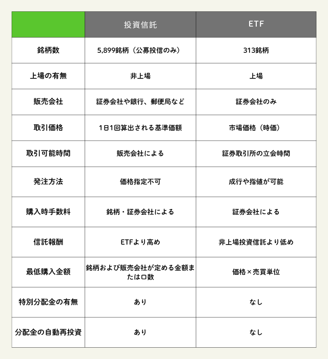 しかし、投資信託とETFには、下記のようにさまざまな違いがあります。