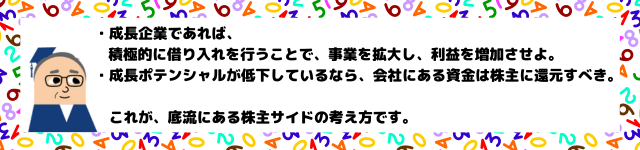日本の企業が内部留保を高め自己資本比率を高めてきたことはROEの観点からはマイナス要因になります。株式市場で配当を高めろとする声は配当利回りが高くなることの他にも、内部留保が高まらないので自己資本が増大しないことも理由なのです。自社株買いについても株式需給が改善する他にも自己資本が縮小する効果があります。