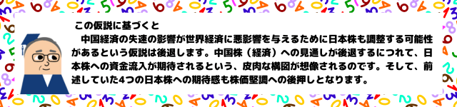 ※執筆後記にて解説をするとしたところを下記に示します。短期的視点で中国経済の失速により中国株から日本株に資金移動が行われる仮説を示しました。ただ、これは長期に継続されるものではありません。どこかで中国株が大幅アンダーウェイトになれば、そこで資金移動は終わります。中国景気が長期的に失速してゆくなら、それが世界経済に与える影響を考えなければなりません。これが長期的視点での問題です。