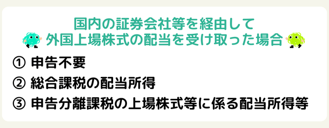 日本国内の証券会社を経由した場合は源泉分離課税、総合課税、申告分離課税が選択できます。源泉分離課税の場合、外国税額控除の適用を受けることができず、源泉徴収の還付を受けることができませんが、外国上場株式の配当額は合計所得金額・総所得金額等に含まれないため配偶者控除や住宅ローン控除を利用する上で有利になることがあります。総合課税や申告分離課税は外国税額控除の適用を受けることができます。