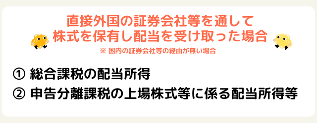 日本国内の証券会社を経由せずに直接外国の証券会社を通じて配当金を受け取った場合は総合課税と申告分離課税の2種類の課税方法があります。外国の証券会社を通じた場合は日本で20.315%の税率による源泉徴収が行われていないので源泉分離課税は選択できません。