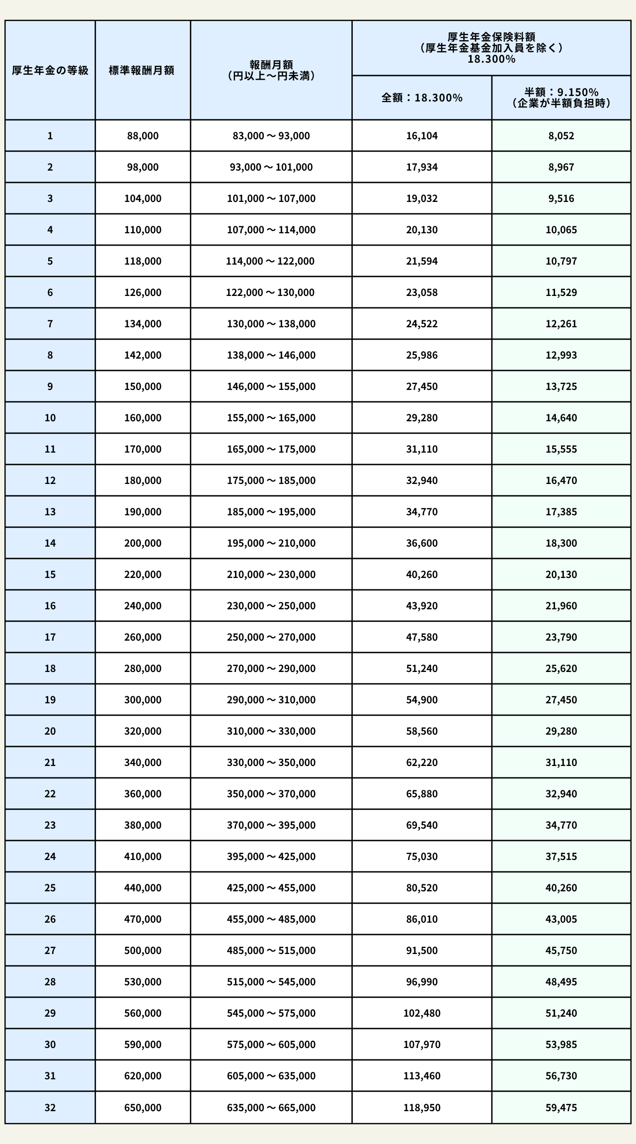 該当期間に平均で得た標準報酬額をそれぞれ計算します。また下の表は月額納付厚生年金保険料に伴う、標準報酬月額です。給与明細等で納付している保険料を確認すると、当年度の自身の標準報酬月額も知ることができます。