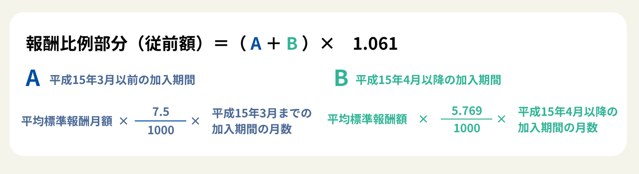 また報酬比例部分には従前額というものがあり、これは平成6年の水準で標準報酬を再評価し、年金額を計算したものです。計算した数値が『上記の報酬比例部分<報酬比例部分(従前額)』となる場合は従前額が報酬比例部分の額に適応されます。