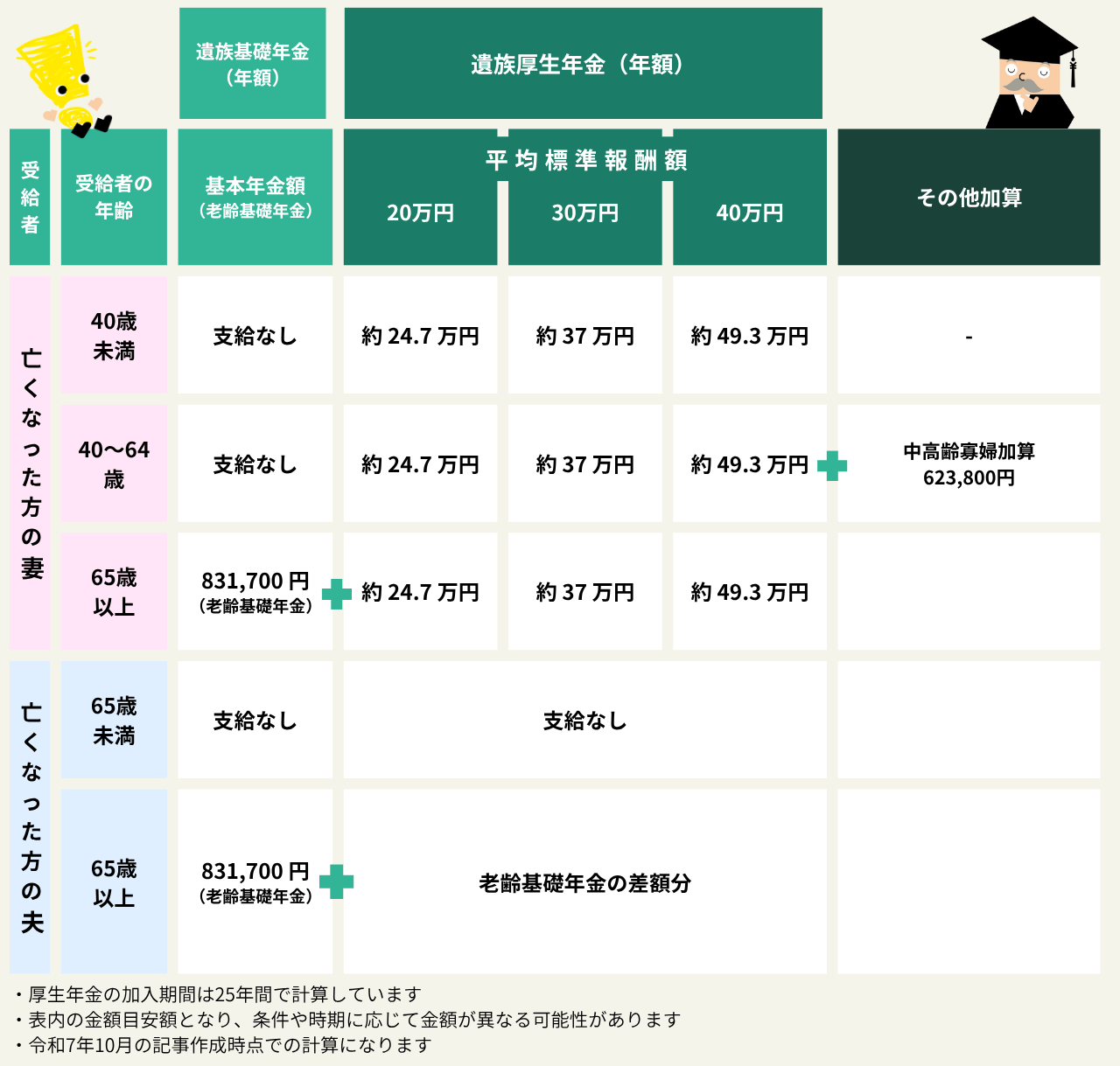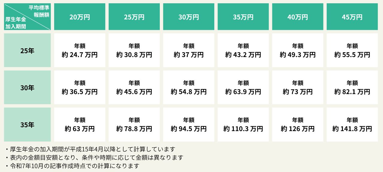 例えば、標準報酬月額が20万円台の場合、遺族厚生年金の年間支給額は25年加入で約25万円前後、35年加入は約63万円前後になります。標準報酬年額が高くなればその分金額も大きくなる見込みがあります。