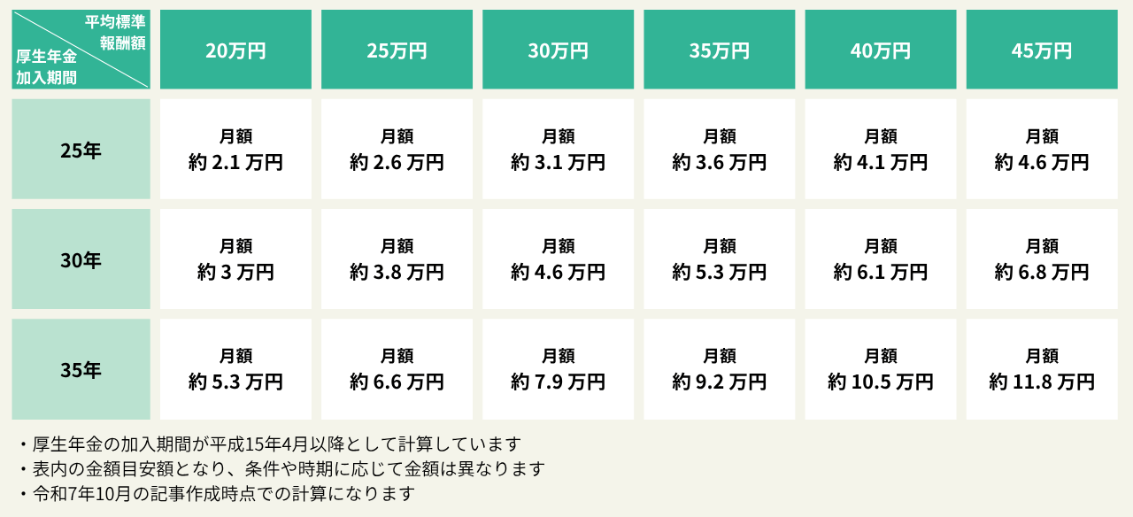 ここでは標準報酬月額の代表的な例を挙げて、受給額の目安を把握しやすいようにまとめています。平均標準報酬月額や厚生年金加入期間、家族構成別にわかりやすく早見表で見てみましょう。