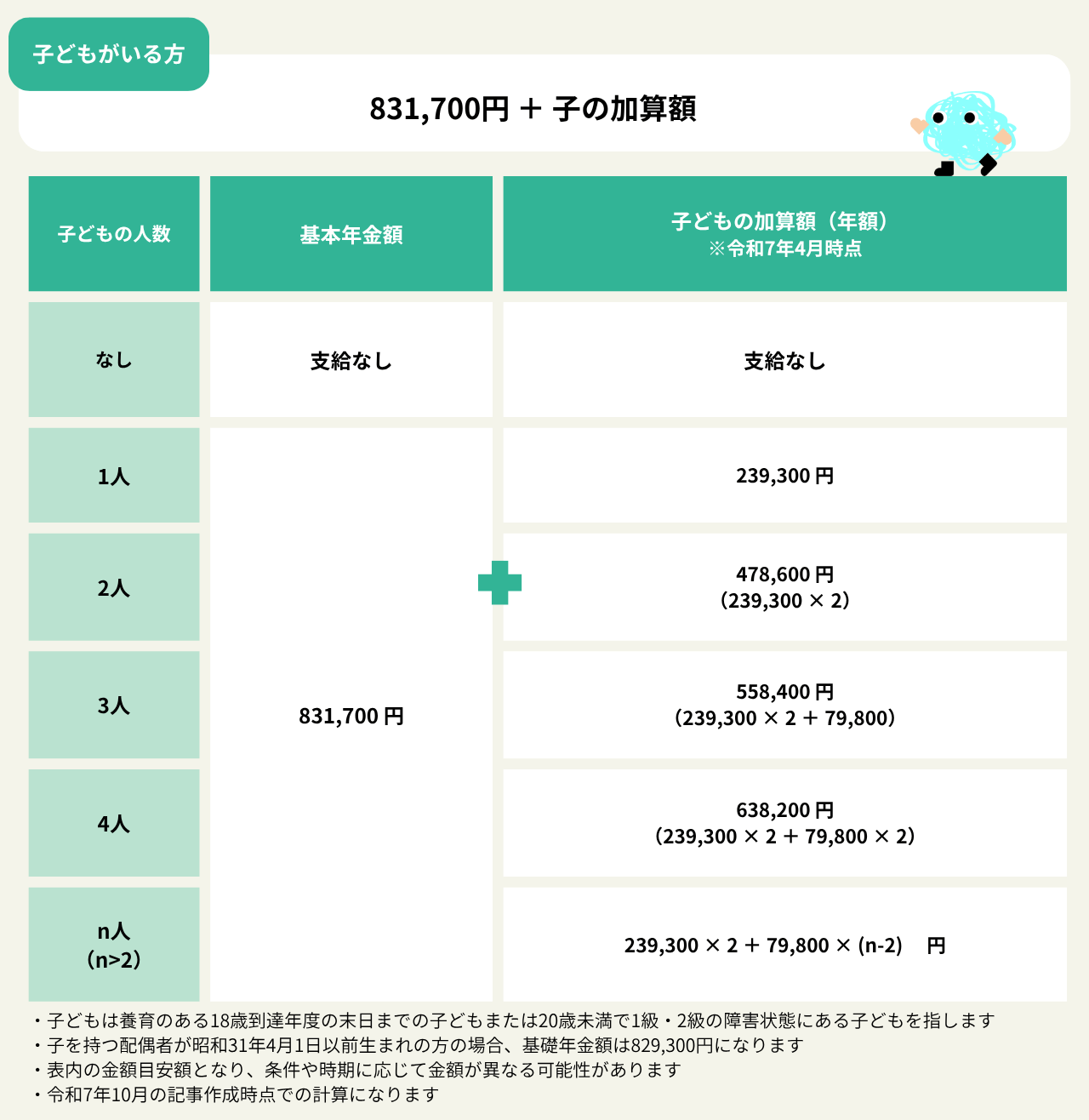 ここでは子供がいる場合、遺族厚生年金のほかに遺族基礎年金が加算されます。また人数が多くなるとその分加算額も増していく仕組みです。