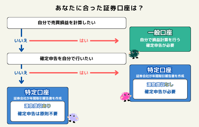 証券口座には「一般口座」と「特定口座」があり、税金の取り扱いや申告の手間が異なります。特定口座(源泉徴収あり)は基本的には確定申告不要となります。