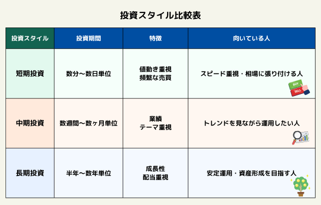 投資スタイルは「短期」「中期」「長期」に分かれます。短期は値動きの激しい銘柄を狙い、リスクも高め。中期・長期は企業の成長性や配当を重視し、時間を味方につけて資産を増やす戦略です。