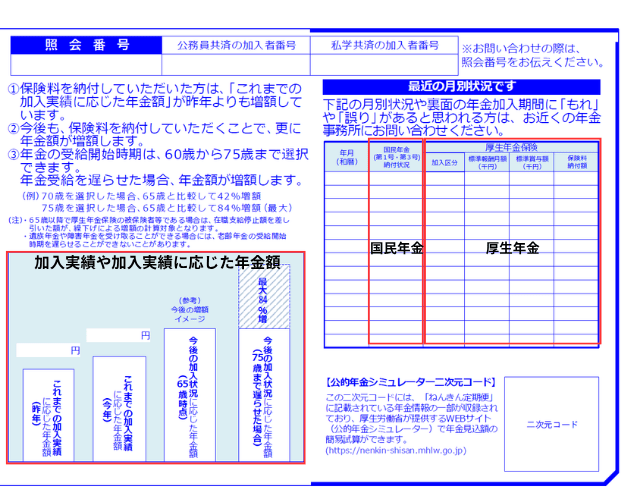 ハガキタイプのねんきん定期便は、主に50歳未満の方を対象とし、基本的な加入実績や保険料納付状況が簡潔に示されます。特に最近1年分の月別状況が記載されているため、支払い漏れや納付状況の確認に最適です。ハガキタイプは情報量がコンパクトですが、国民年金や厚生年金の合計加入期間を簡易的に把握できる点がメリットです。