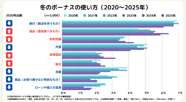 さらに、「食品(普段食べるもの)」と回答する人が増えている点も見逃せません。ここ数年で回答数が大きく伸びており、食料品価格の上昇などインフレの影響を受け、毎月の生活費負担が重くなっている現状が反映されている可能性があります。ボーナスが「特別な支出」だけでなく、「生活を支えるための補填」としての役割も担い始めていることが読み取れます。