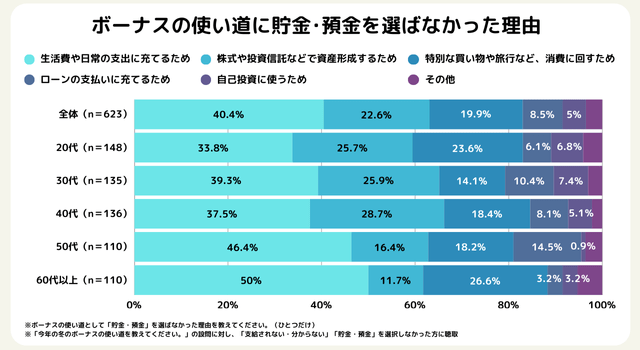 冬のボーナスで「貯金・預金」を選ばなかった人の理由を見ると、年齢によって特徴的な違いが表れています。全体では「生活費や日常の支出に充てるため」が最も多く、ボーナスが家計の補填として使われている実態がうかがえます。この傾向は50代・60代以上で特に顕著で、生活費負担や固定費が重くなる年代ほど、ボーナスを生活防衛のために使わざるを得ない状況が見えてきます。