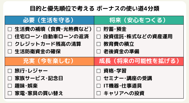 「生活を守り安定させるために必要なもの」、「将来のためのもの」、「生活を充実させるためのもの」、「成長するためのもの」に分類して、項目が多いものほど自分にとって優先度が高い使い道といえます。この整理を行ったうえで、使い道の「割合」を決めていくと納得感のあるボーナス配分につながります。