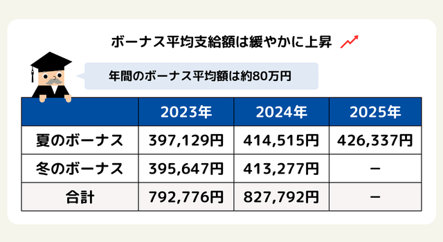 厚生労働省の統計によると、ボーナスの平均支給額はここ数年、緩やかな増加傾向にあります。夏のボーナスは2023年に約39.7万円、2024年に約41.5万円、2025年には約42.6万円と、毎年少しずつ水準を切り上げています。冬のボーナスも2023年が約39.6万円、2024年が約41.3万円と増加しており、年間では平均して80万円前後が一つの目安といえるでしょう。