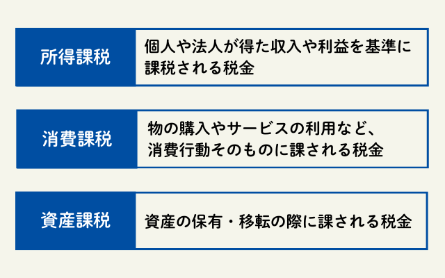 税金は、課税対象に応じて所得課税・消費課税・資産課税の3つに大別することができます。