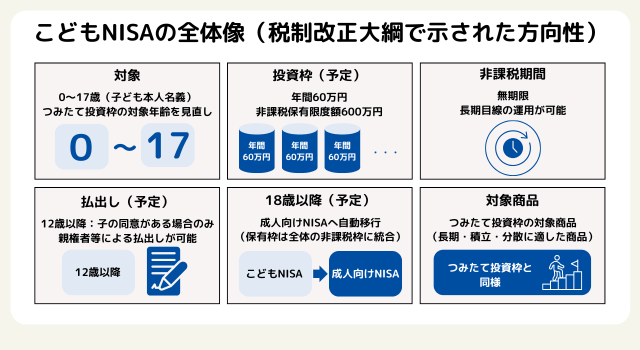 こどもNISAの大前提は、0~17歳の子ども本人名義で、つみたて投資枠を活用して資産形成を行うことです。税制改正大綱では、18歳未満でもつみたて投資枠を利用できる方向性が示されました。