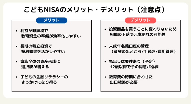 こどもNISAは、非課税枠を活かしながら教育資金などの準備を進められる一方、投資である以上、価格変動リスクや管理面の注意点もあります。大切なのは、メリットだけで判断をせず、デメリットも含めて「家庭に合う運用の形」を作ることです。ここでは、判断材料として押さえておきたいポイントを整理します。