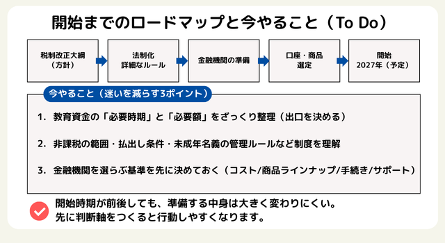 ここまで見てきたとおり、こどもNISAは「0~17歳のつみたて投資枠拡充」「年間60万円・非課税保有限度額600万円」「非課税期間は無期限の見込み」「払出しは12歳以降に子の同意が必要」「18歳以降は成人NISAへ移行」など、従来のジュニアNISAとは設計が大きく異なります。制度の詳細は今後の法制化で確定していきますが、開始時期が前後しても“準備すべきこと”は大きく変わりません。迷いを減らし、制度開始後にスムーズに動くために、次の3点を先に整えておきましょう。
