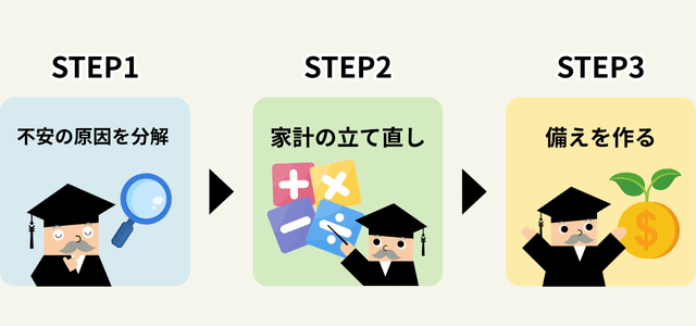 本記事では、不安の正体(原因)を分解して整理し、家計の立て直し→備えの作り方まで、今日から実行できるステップとして解説します。数字が苦手でも取り組める順番でまとめるので、できるところから始めていきましょう。
