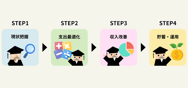 おすすめは、まず現状を数字で把握し、次に固定費を中心に支出を整え、同時に収入の上げ方も検討し、最後に貯蓄と資産形成を仕組みにする流れです。
